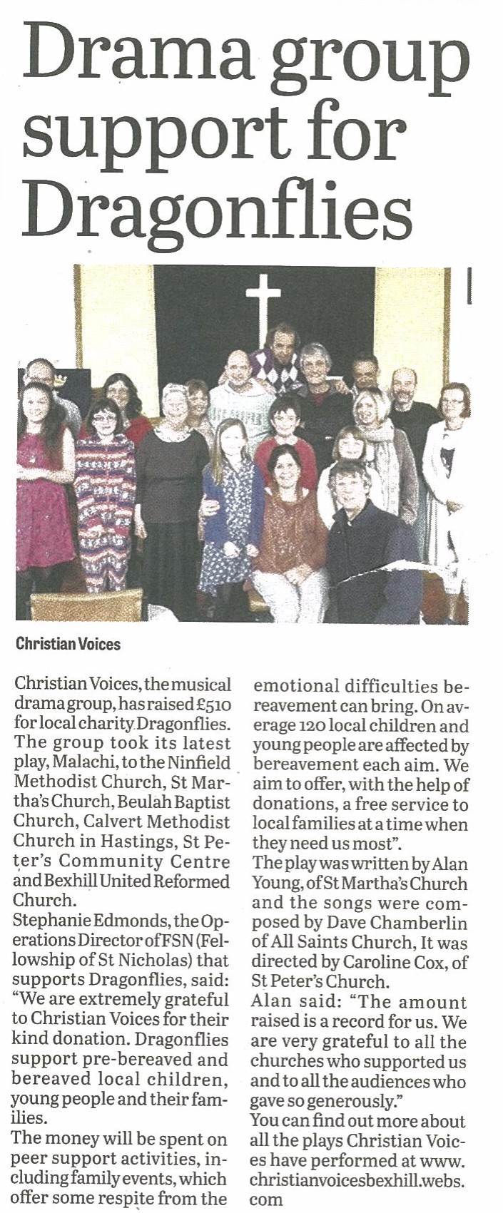 Christian Voices are proud to announce that through the generosity of our audiences for Malachi were we able to raise £510 for the Dragonflies charity.
